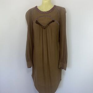 BY ISABEL MARANT ETOILE HERE IS A BEAUTIFUL AND COMFY DRESS OR TUNIC. IT IS DONE IN TAUPE AND IS 54% VISCOSE AND 46% COTTON. THIS WONDERFUL ISABEL IS LOOSE FITTING. IT FEATURES A SOFT FRINGED YOKE ACROSS THE CREW NECK AND UPPER BODICE. THE SLEEVES ARE LONG AND FINISHED WITH BUTTON CUFFS. THE HEM IS SOFT AND CURVED,SHORTER ON THE SIDES. SIZE EURO 36, U.S. SMALL, PLEASE NOTE THE MEASUREMENTS, EXCELLENT CONDITION! NWOT