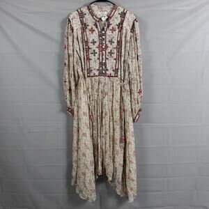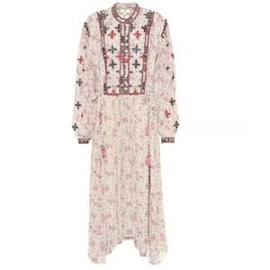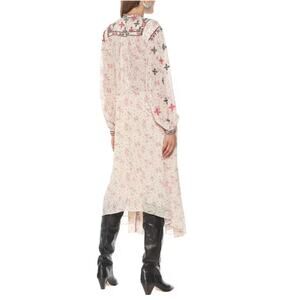 Elegant floral midi dress by Isabel Marant. Features a delicate cream base with pink floral patterns. Long sleeves and a flowing silhouette.