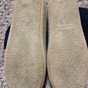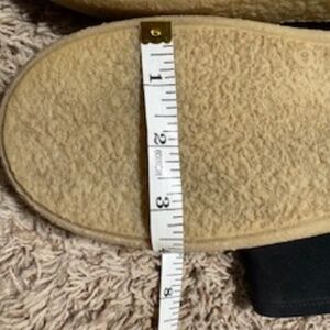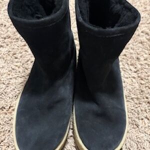 Black calf suede shearling lining tonal stitching round toe slip-on style ankle-length branded insole flatform sole.100% Calf Suede, 100% Lamb Fur, 100% Rubber sole.