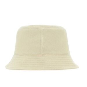 New, never worn. Ecru gabardine cotton bucket style hat with black embroidered logo.
