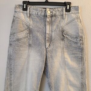Isabel Marant Kelissa Trouser Gray Jeans. Isabel Marant's straight-leg 'Kelissa' jeans have a faded finish and ultra high waist that gives them a vintage look. Cut from gray denim, they're stitched with vertical seams and have zipped cuffs. Nail this season's Western trend by teaming yours with cowboy boots. They are in excellent preowned condition.