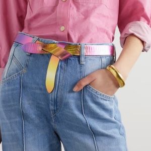 - Sunset-inspired hues wash over this leather belt finished with a metallic sheen