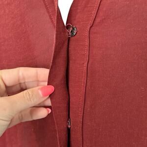 Elegant long sleeve tunic dress in a rich maroon-burgundy hue. Features a flattering V-neck with snap closure, slightly padded shoulders, and a modern high-low split hem. Lightweight material that feels like linen or a silk-linen blend. Effortlessly chic and versatile for fall styling.