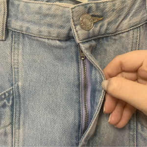 High rise. Oversized side pockets. Back patch pockets. Straight legs. Cropped above ankles. Button/zip fly; belt loops.