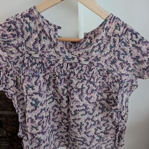 Chic blouse with intricate purple and cream pattern. Lightweight and stylish. Ideal for versatile wear.