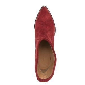 Chic red suede ankle boots. Pointed toe design. Stacked heel for added height.