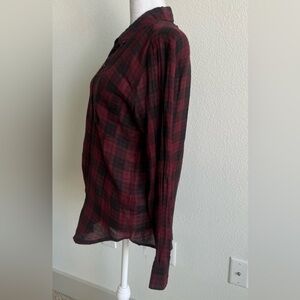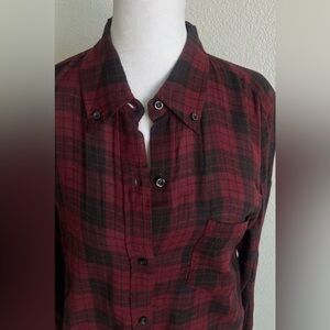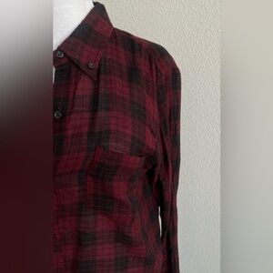 Chic checkered shirt with button closure. Features a bold red and black design. Worn once