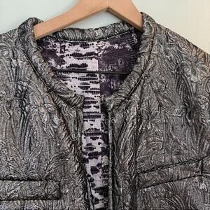 One side has a jacquard pattern metallic gunmetal silver pattern, the other has a silky really cool snake print