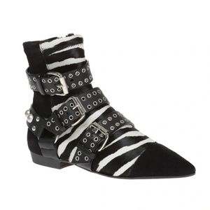Stunning ankle boots from French designer Isabel Marant's collection. These "Rolling" ankle boots feature a zebra print pony calf hair design with stylish grommet/eyelet buckle strap details.
