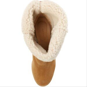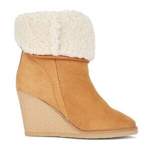 Genuine shearling brings cozy comfort to this cuffed almond toe bootie elevated by a sculptural crepe-rubber wedge heel. Wear straight or folded down to the length you desire.