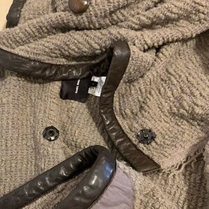 Wrap Sweater with brown leather button closure creating a cowl neck look.