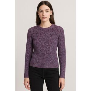 This sweater is an Isabel Marant design made of cotton. It features a finely open knitted texture with a blend of colors, predominantly red with hints of white and blue, creating a marled effect. The design includes long sleeves and a fitted silhouette, showcasing a classic and versatile style. The neckline and hem are subtly finished, complementing the sweater’s overall sleek and modern aesthetic.