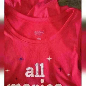 All American Momma distressed letters at front, loose fit. Stretchy.