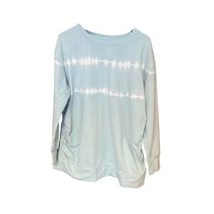 This maternity sweatshirt is by Isabel Maternity for Target. It has a blue and white subtle tie-dye design on the front and back. A very soft cotton material. It was my absolute favorite maternity top. Slight wash wear but overall great condition. No stains or holes.