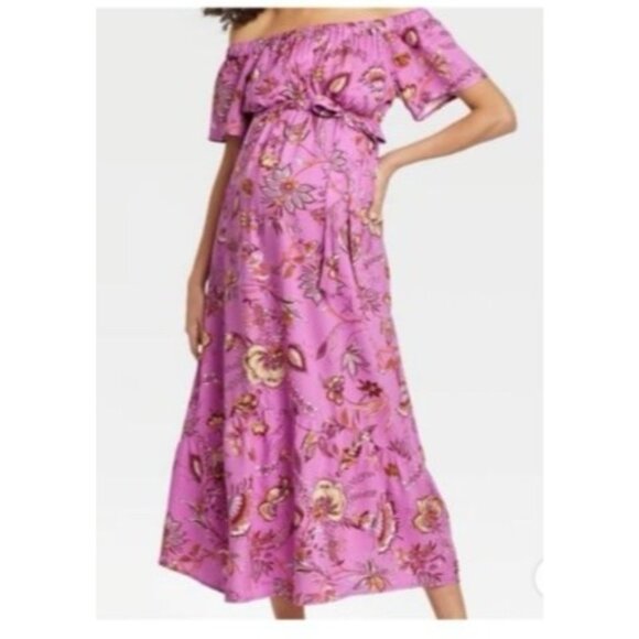 This elegant maternity maxi dress offers comfort and style with its lightweight rayon fabric, floral pattern, and flattering off-shoulder design.