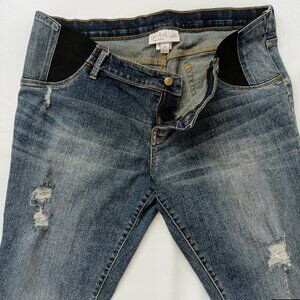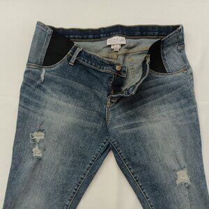 Isabel Maternity By Ingrid & Isabel are a popular style of maternity jeans designed to be worn throughout and after pregnancy. They are known for their flexible "Crossover Panel," which can be worn up for full belly coverage or folded down for extra support. The jeans are made with power stretch denim that is designed to shape and adjust to a changing body, providing gentle back support as the belly grows. This specific style features a distressed look with rips on the knees and a cropped, skinny leg. The design is intended to provide comfort without slipping or digging in at the belly.