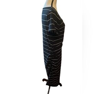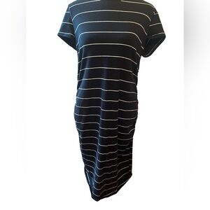Isabel & Ingrid maternity dress, black and white stripes, short sleeves, ruched elastic at the sides, tag size large, stretchy material.