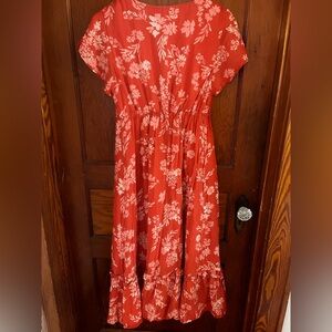 Elegant red dress with floral patterns, perfect for any occasion. Only worn twice. 🐈‍⬛🐕🚭