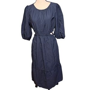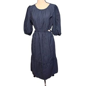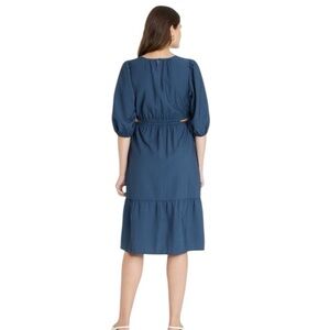 midi dress framed by a crew neckline features functional side pockets, chic side cutouts and a tiered style for added flair. The midweight poplin fabric and elastic on the waist provides a comfortable fit, while the back keyhole button makes the dress easy to wear.