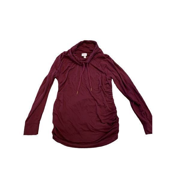 Isabel Maternity Ingrid & Isabel Burgundy Drawstring Cowl Neck Long Stretchy Top. Beautiful deep, rich burgundy color with rose gold caps on the neck drawstrings. Side elastic ruching for comfort throughout your whole pregnancy. This is a longer top, great with leggings for extra bum coverage. Preloved, with normal wash wear.