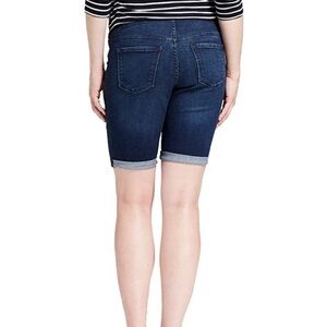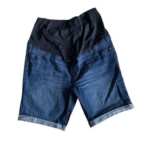 Excellent Condition Bermuda dark jean shorts with a roll cuff and a crossover full tummy panel. Jeans are stretchy and super comfortable for pregnant mommas. Panel can be worn full or rolled down. The hem of the shorts can be rolled up shorter if desired. No pilling. No visible wear. Size 18.