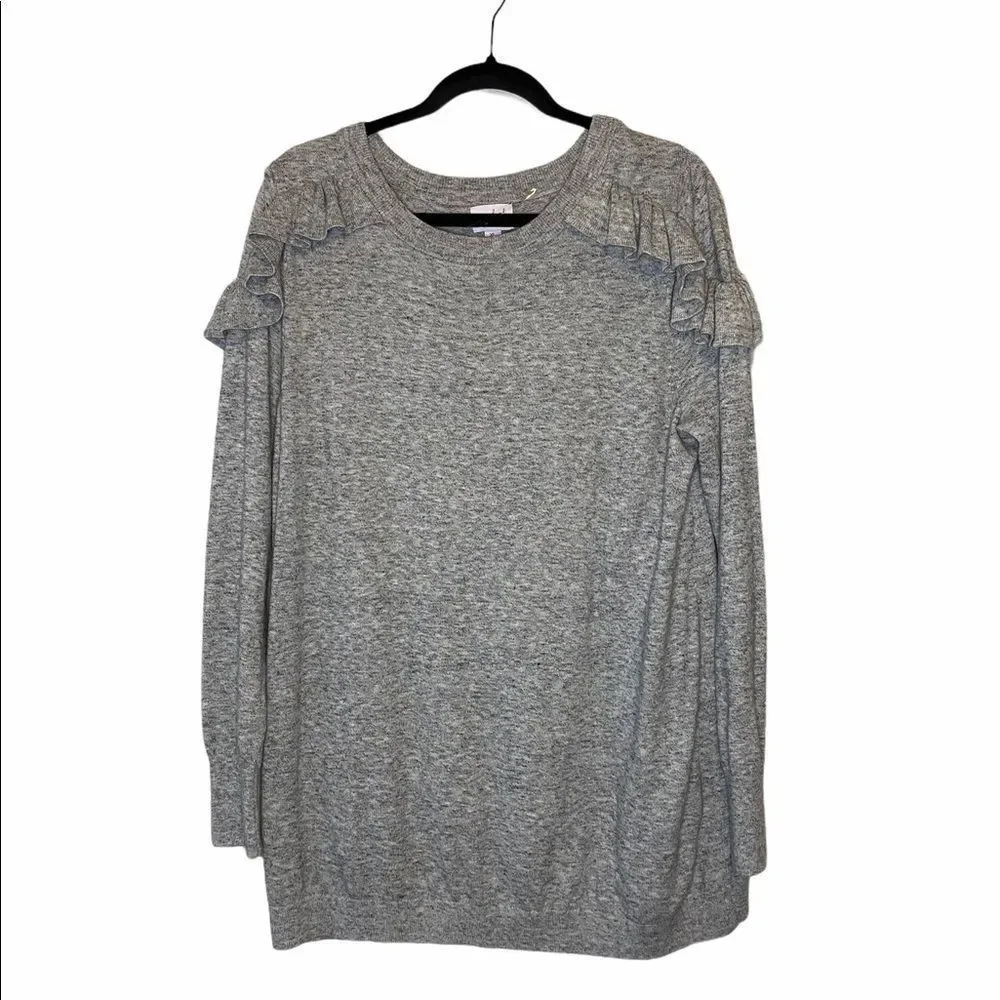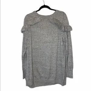 Beautiful heather gray pullover sweater, ruffle detail on shoulders. Soft abs comfortable