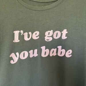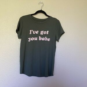 Details: Pull over. Short Sleeve. "I've got you babe" lettering. Scoop Neck.