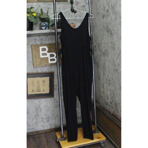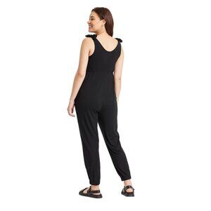 Comfortable black maternity jumpsuit. Sleeveless design with side tie detail. Perfect for casual wear.