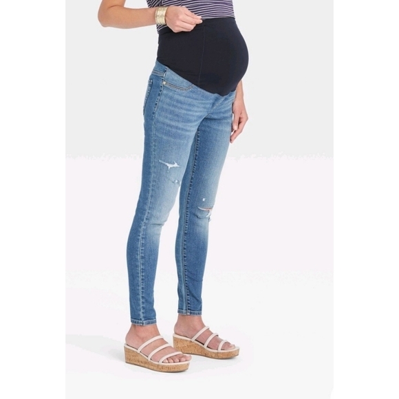 Stylish maternity skinny jeans. Comfortable stretch fabric. Classic blue wash with distressed details.