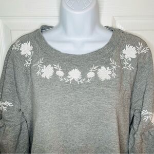 Isabel Maternity by Ingrid & Isabel Floral Embroidered Yoke Sweatshirt Grey Size Medium. Long sleeves. Soft comfy maternity sweatshirt. Whit floral embroidery around yoke and top of sleeves. Gently used Excellent Good Condition. No holes or stains.