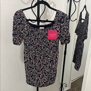 Charming floral top with dark blue and light pink design. Perfect for casual wear. Soft and stretchy fabric.