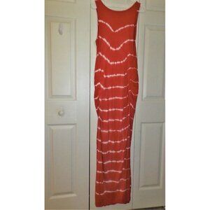 Long tie dye striped tank dress with side slits and side ruching. Scoop neck, sleeveless.