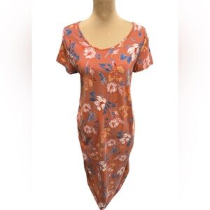 Chic orange midi dress with floral pattern. Short sleeves. Perfect for casual outings.
