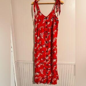 This vibrant red sundress features a delicate white floral print, perfect for a wedding guest or resort wear. The sleeveless design with spaghetti straps and a flowing maxi silhouette offers a relaxed yet elegant look. The fitted bodice transitions into a loose, flowing skirt, creating a flattering and comfortable fit.