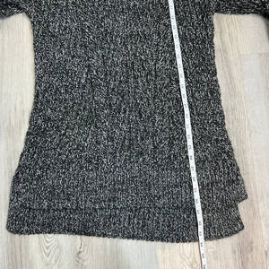 Charcoal gray, thick knit sweater dress. Crew neck maternity sweater, white and gray knit pattern. High low, maternity dress style.
