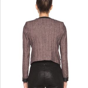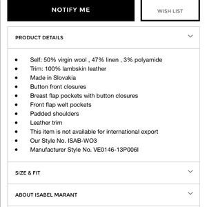 Please see the 5th picture for details about this item. Jacket is very fitted with a raw hem. Sold out everywhere. Almost impossible to find this color. The few you can find for sale are the mustard color. Please refer to the size chart for sizing. One thing I will say about the sizing is that the arms are smaller and it has no stretch so if you have a little larger than average arms, this will be too tight. Absolutely gorgeous jacket, really hate to let it go but I will for the right price.