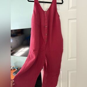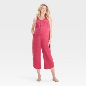 Add comfy texture to your pregnancy wardrobe with this Gauze Maternity Jumpsuit from Isabel Maternity by Ingrid & Isabel™. Finished in a solid shade with a distinct crinkled texture, the sleeveless jumpsuit features a scoop neckline and front buttons for a stylish look. It’s made of midweight gauze cotton fabric with soft lining for comfortable wear and comes with side-seam pockets that complete the design with hands-free convenience.