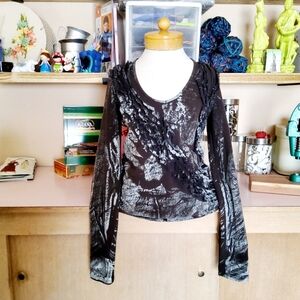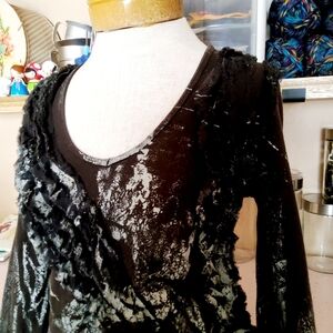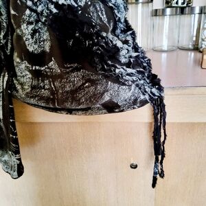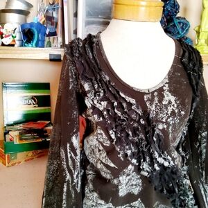 Fabulous and very unique sweater top in black/brown/cream paint and fringed elements is rock 'n roll bohemian splendor.