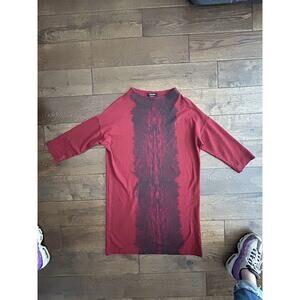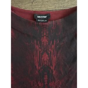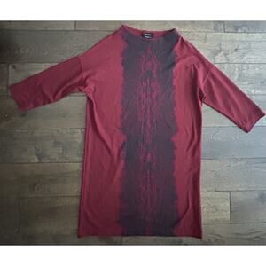 Rare Isabel de Pedro burgundy red bodycon dress with a lace print down the center in black. Size is US 8. Boatneck with 3/4 sleeves. No flaws!