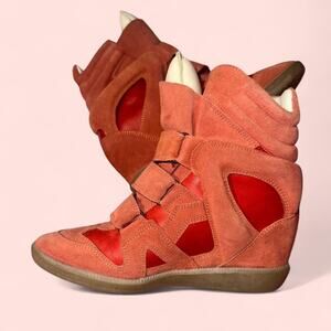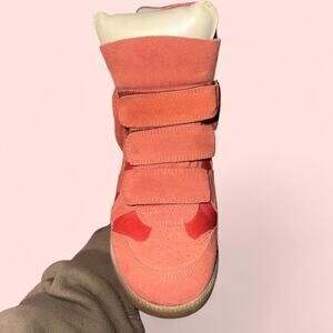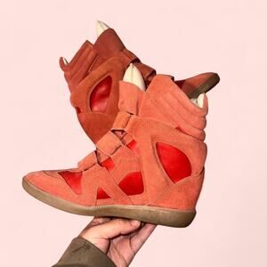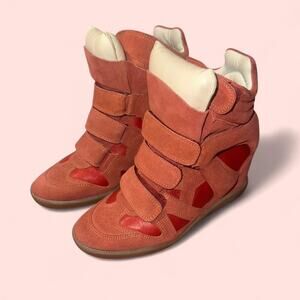 Coral red suede wedge trainers with velcro straps and cushioned insole