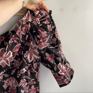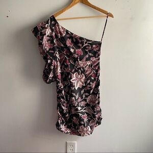 Isabel Marant Lilia one-shoulder floral-print cotton mini dress in Dark Brown/Red whimsical boho bohemian flower print. 100% lightweight cotton, unlined. One sleeve design with exaggerated statement ruffle shoulder and half short sleeve. Pleated detailing at the bust, ruched down both sides for a super flattering fit - fabric is structured but the gathered sections have a touch of give. Hidden side zipper. Gorgeous cocktail wedding guest party date night event dress! Barely worn, excellent condition, no holes/stains.