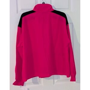 Keywords: cropped bomber jacket, isabella active wear, forza stretch, pink jacket, black accents, stand up collar, ruffle cuffs, activewear jacket, athletic jacket, womens jacket, XL jacket, new with tags, breathable, fast dry