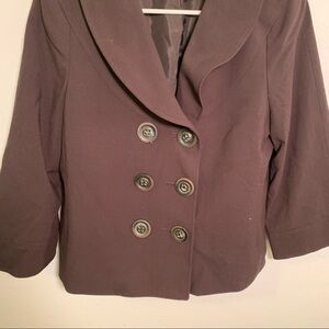 Great condition. Isabella DeMarco. Double breasted Blazer. 3/4 wide sleeves. Round collar. Brown. Lined. Size 4. Stretch 59% polyester, 37% rayon, 4% spandex. Pit to pit laying flat 17.5” Shoulder to hem 23” Sleeve (pit to hem) 14”. All measurements are approximate and taken lying flat. Smoke free home. No trades, offers welcome.