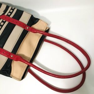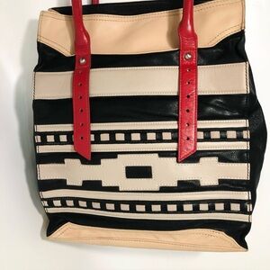 Isabella Fiore leather tote with geometric Southwestern design in black, cream and red. Fully lined with interior zippered pocket. Excellent condition.