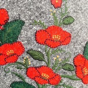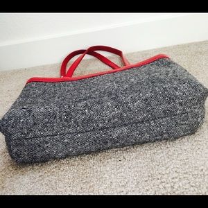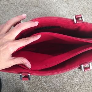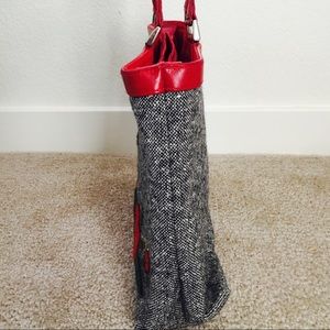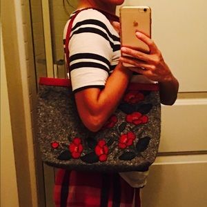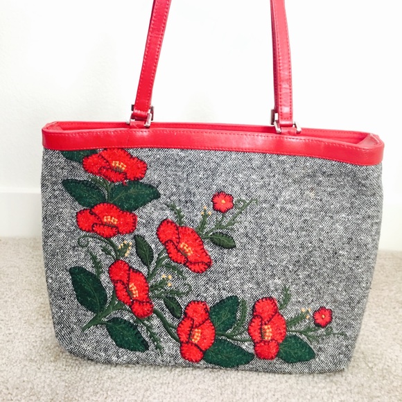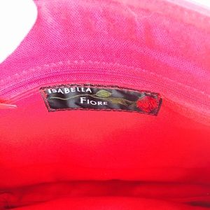 Vintage Isabella Fiore canvas Black Handbag with red/green flower design and red lining/straps. 12.5" x 9.24" x 3.25" with a 9" strap drop