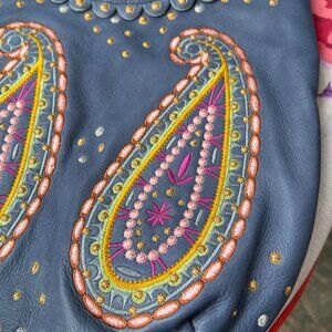 Crafted from supple genuine leather, this bag features bold multicolor embroidered paisley patterns accented with gold-tone studs for a unique, handcrafted look.