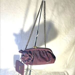 This exquisite Isabella Fiore clutch in a rich plum hue is a perfect blend of style and sophistication. Crafted with a luxurious texture, it features a classic frame closure and a convenient chain strap for easy carrying. Ideal for evening events, this clutch adds a touch of elegance to any ensemble. Comes with small attached coin pouch.