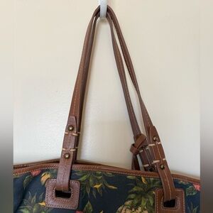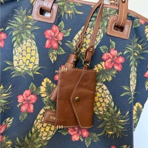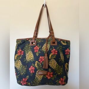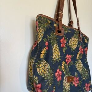 Rare Isabella Fiore navy pineapple print tote. Fabric with brown leather handles and trim. Leather tassle and wallet attached. Snap closure. Inside there is a zippered pocket on one side and two open pockets in the other. Excellent condition. Light weight.