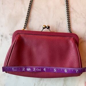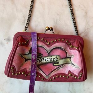 Rare Isabella Fiore leather purse in deep pink with bold tattoo-inspired heart graphic that reads Wicked. Detailed with antique brass studs, kiss-lock closure, and chain strap. Compact but edgy, this collectible bag makes a perfect statement piece.