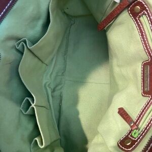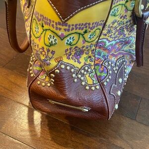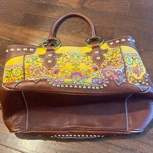 This purse features a bright and fun floral pattern with a chic leather accents. This goes perfectly with all your spring and summer outfits. This bag is gently used